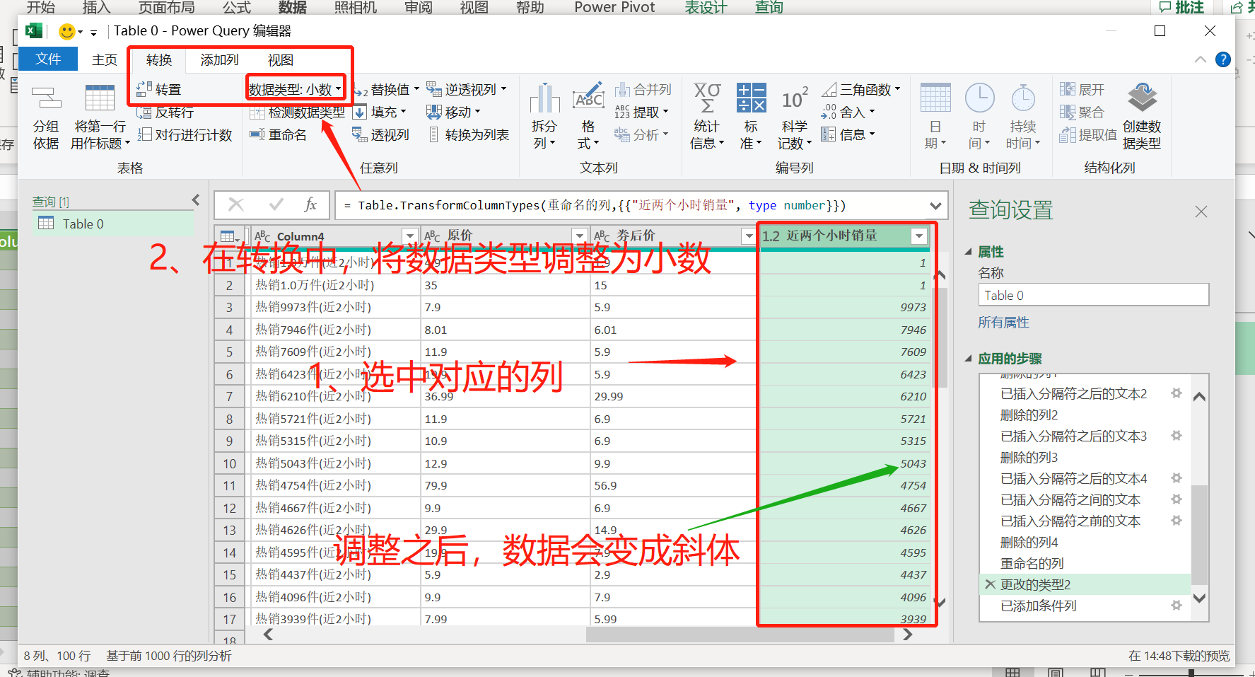 3、将文本格式调整为数字格式:选择对应的列,在编辑器上部选择【转换】,将数据类型选择为【小数】,这列数字就会变成数字格式(斜体显示)