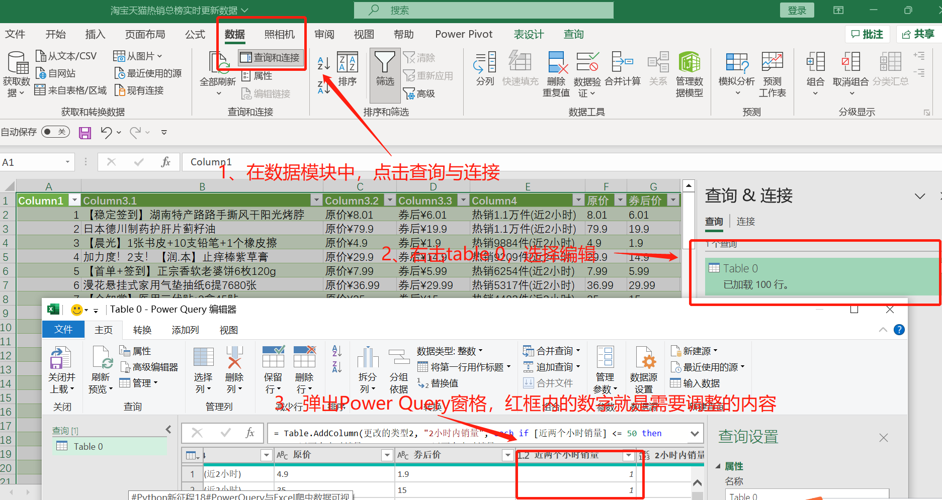 1、在实时更新的excel表格内打开Power Query窗口:在【数据】中选择【查询与连接】,在弹出的窗口中就可以看到对应的table表格。鼠标右击table(0),点击编辑,我们熟悉的Power Query窗格就弹出来了。