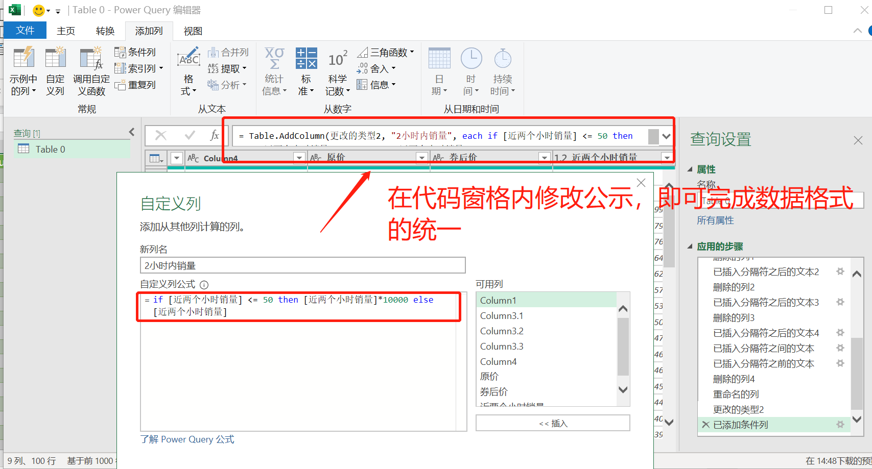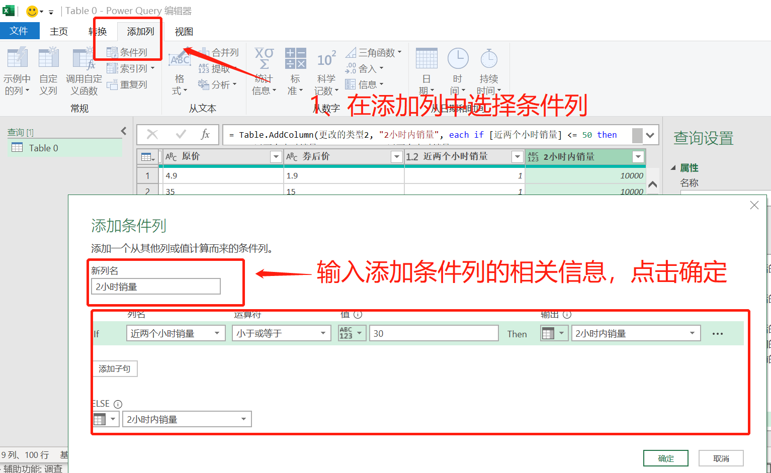 4、将数字格式统一:在编辑器【添加列】中选择【条件列】,弹出的窗口中填入相关信息,然后点击确定。之后表格内自动添加了按照【新列名】命名的新的一列,但是数字格式还是未调整完毕,需要进行接下来的操作