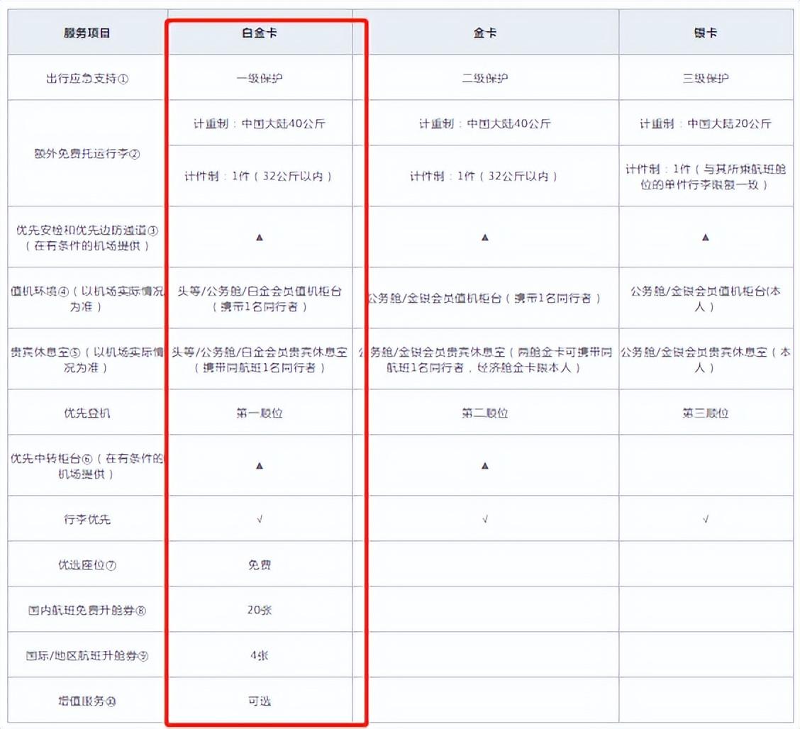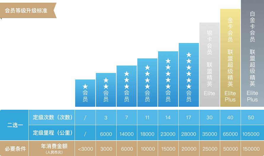 其中,白金卡会员为等级会员的最高级别,升级白金卡会员的必要条件是年消费金额15万元,以及定级次数为50次或者定级里程为105000公里。白金卡会员享受出行应急支持一级保护、额外免费托运行李(中国大陆40公斤)等礼遇。