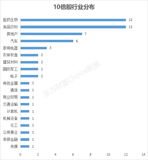 紧随其后的是房地产和汽车两大行业,分别有7家和6家公司经过20年发展成为10倍股。