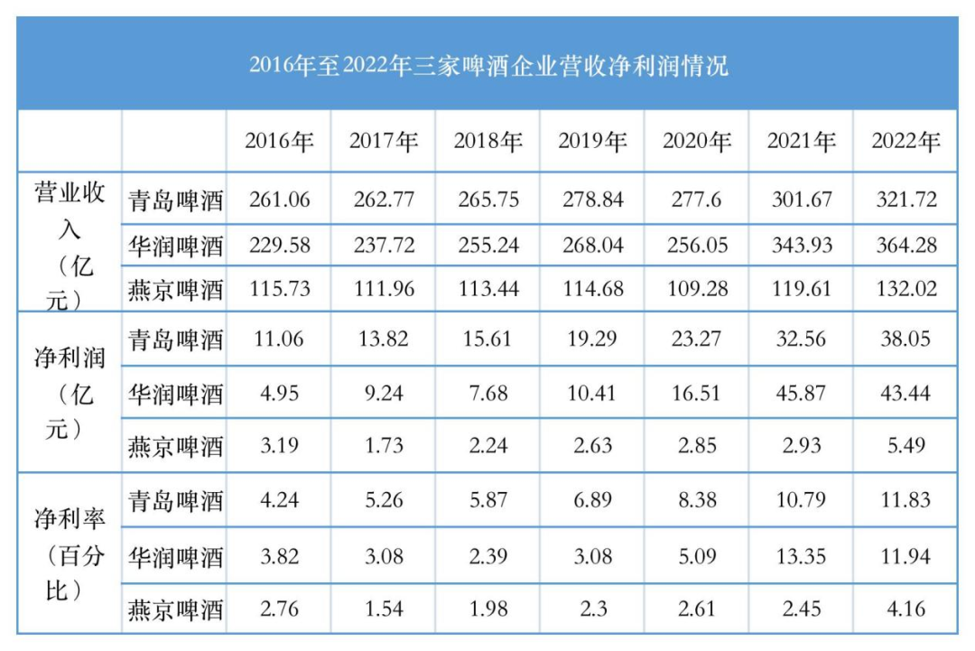 以营业收入为维度,青岛啤酒、华润啤酒营业收入2022年均超过300亿元,燕京啤酒比之差额超过两百亿元。
