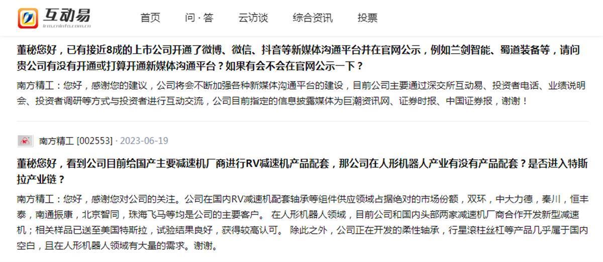 对该小作文引起的遐想,南方精工在互动平台再“添一把火”。6月19日,有投资者在深交所互动易上提问,董秘您好,看到公司目前给国产主要减速机厂商进行RV减速机产品配套,那么公司在人形机器人产业有没有产品配套?是否进入特斯拉产业链?