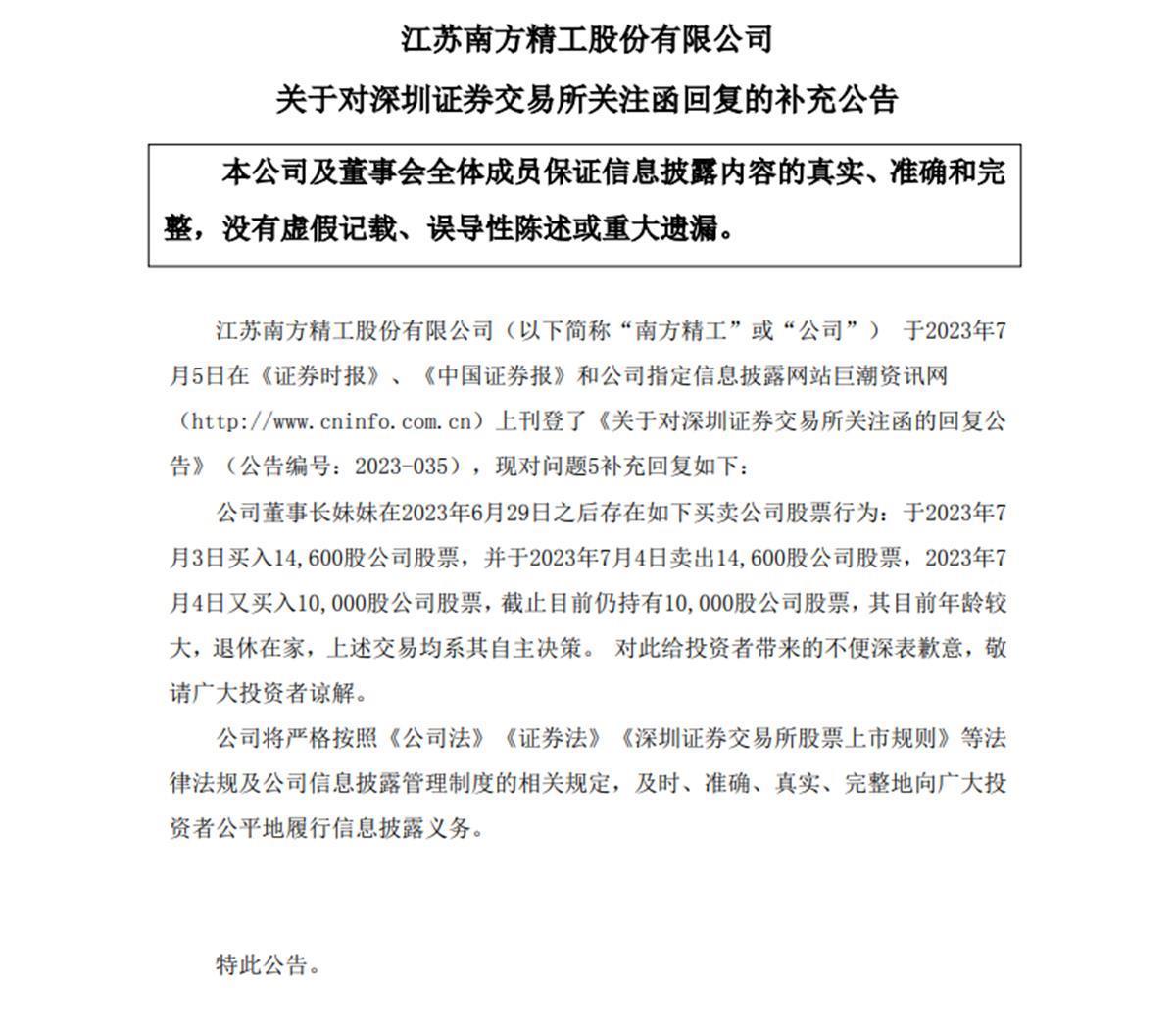 南方精工在7月5日的回复公告中披露,公司董事长妹妹于6月19日买入5900股上市公司股票,并于6月27日卖出5900股上市公司股票。