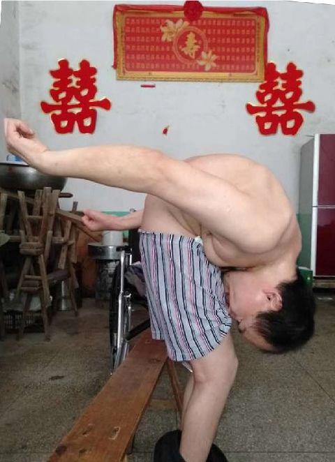 最近10年,李华的病情愈发严重,腰已经完全直不起来,整个上半身都“栽”了下去,5年前,彻底成了“折叠人”。