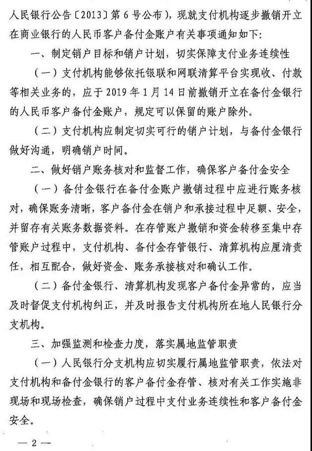 2018年11月底,中国人民银行支付结算司下发《关于支付机构撤销人民币客户备付金账户有关工作的通知》特急文件,规定支付机构应于2019年1月14日前撤销人民币客户备付金账户。
