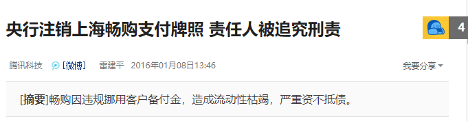 据统计,畅购风险事件造成资金风险敞口达7.8亿元,涉及持卡人5.14万人。2016年1月,中国人民银行注销畅购公司《支付业务许可证》。