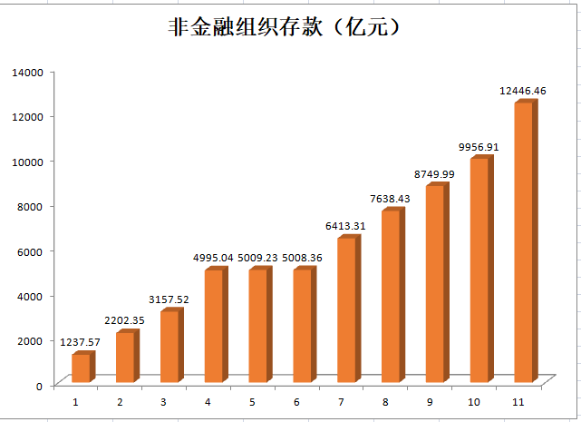 人民银行最新公布的数据显示,截至2018年11月末,非金融机构存款余额为12446.46亿元,较10月末新增2489.55亿元。