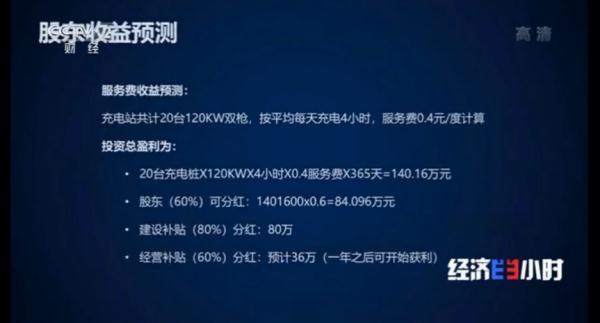 另外,要想获得更高的回报,则可以选择投资充电站。一个充电站共有20台充电桩,按平均每天充电4小时,服务费0.4元/度计算,一个充电站一年的盈利将达到140.16万元。