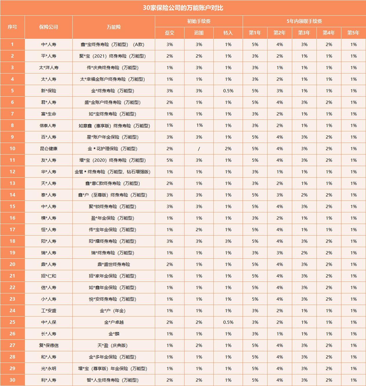 2.低领取费用:趸交、追加、收取1%的费用,但是有持续奖励,第五个保单年度后仍有效,可以奖励1%,相当于后期又进行了返还!前五年的部分领取费用为3%、2%、1%、1%、1%,也是非常有优势的。桐桐找出了市场上几十款万能账户进行对比,我们一起来看下: