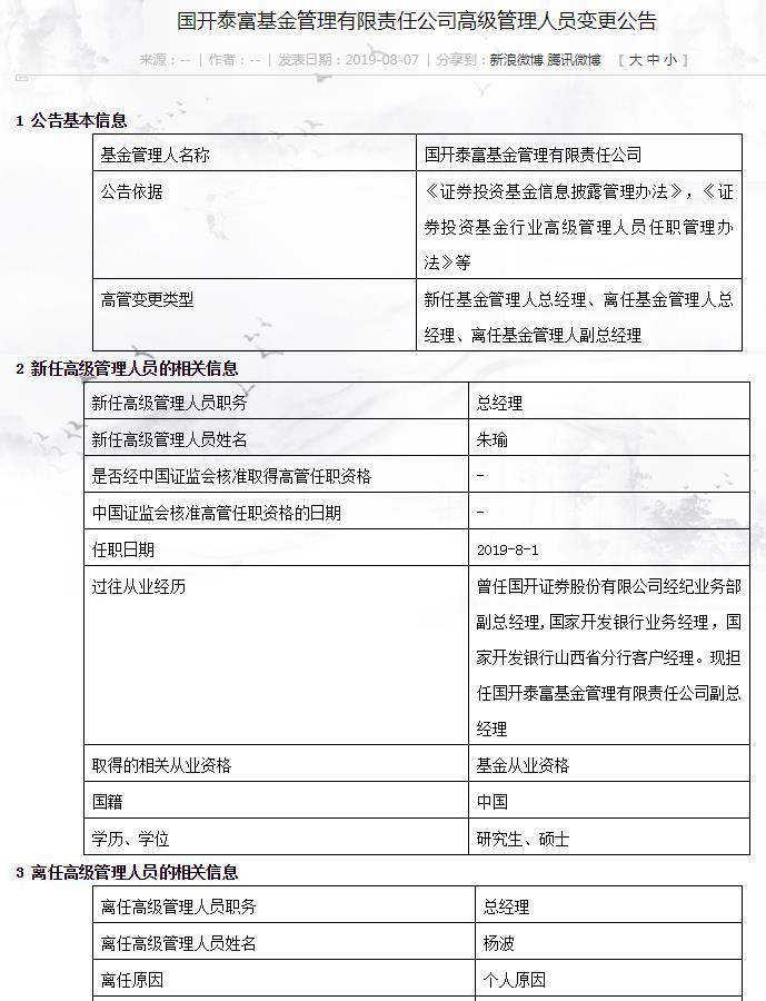 8月7日,国开泰富基金管理有限责任公司(简称“国开泰富”)公告,总经理杨波因为个人原因,已于8月1日离任,副总经理朱瑜于当日接替杨波升任公司总经理。