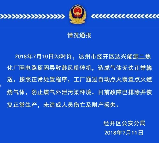 10日深夜,达州市公安局经开区分局发布警情通报,称:7月10日23时许,达州市经开区达兴能源二焦化厂因电路原因导致鼓风机停机,造成气体无法正常输送,按照正常处置程序,工厂通过自动点火装置点火燃烧气体,防止煤气外泄污染环境。目前故障已排除并恢复正常生产,并未造成人员伤亡及财产损失。