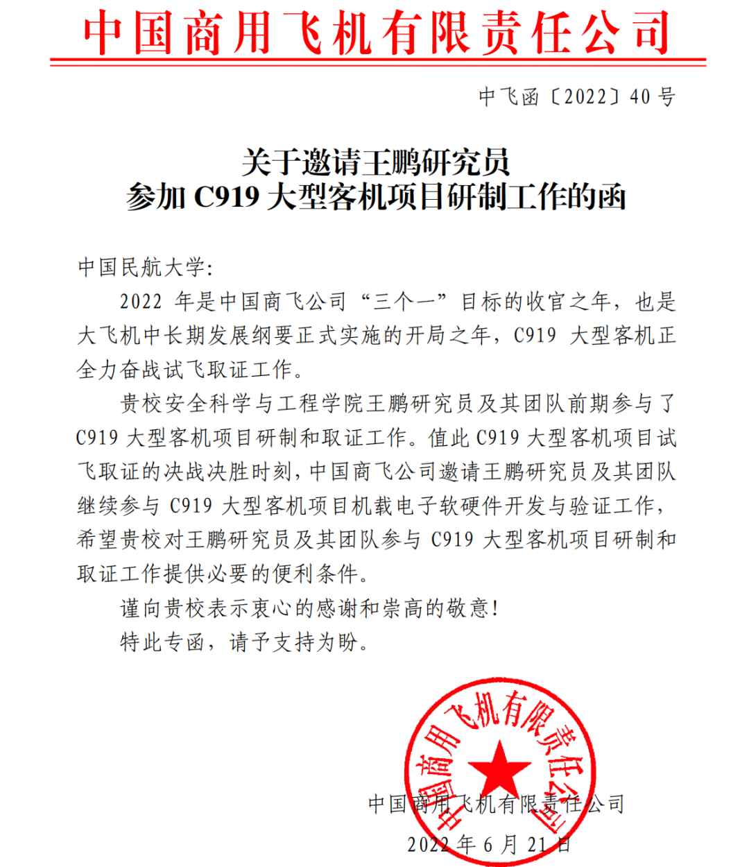 中国民航大学安全科学与工程学院研究员王鹏及其团队在2022年暑期参与C919大型客机项目飞管系统机载软硬件开发与验证、飞控系统安全性分析等工作,为C919适航取证计划的实施提供重要技术支持。