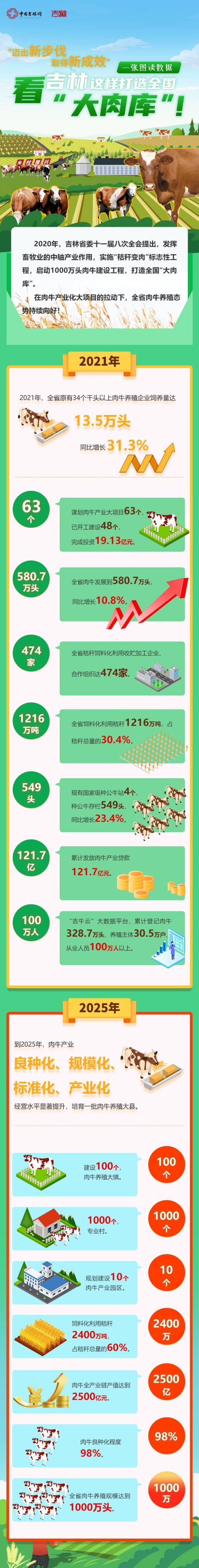 如今,在吉林大地上,正描绘着产业兴旺、生态宜居的新画卷。而在这幅壮美画卷中,肉牛产业跨越发展,将是其浓墨重彩的一笔。“秸秆变肉”的持续实施,将加速助推吉林打造全国“大肉库”。预计到2025年,全省肉牛养殖规模将达到1000万头。