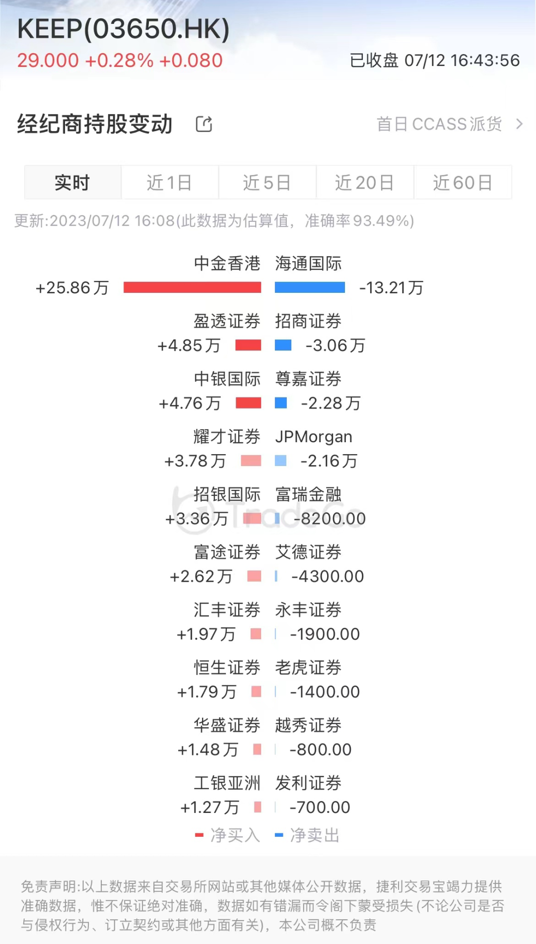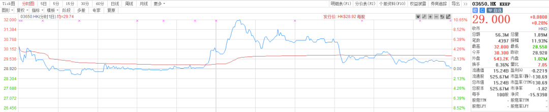 KEEP开盘高开4.77%,报30.30港元/股,之后回落在招股价间震荡,午盘后拉升,一度涨幅超10%,随后阶梯式回落,收报29港元/股,微涨0.28%,成交量189.02万股,成交额5629.85万,最新总市值为152.44亿港元。不计手续费及佣金,每手100股赚8元。