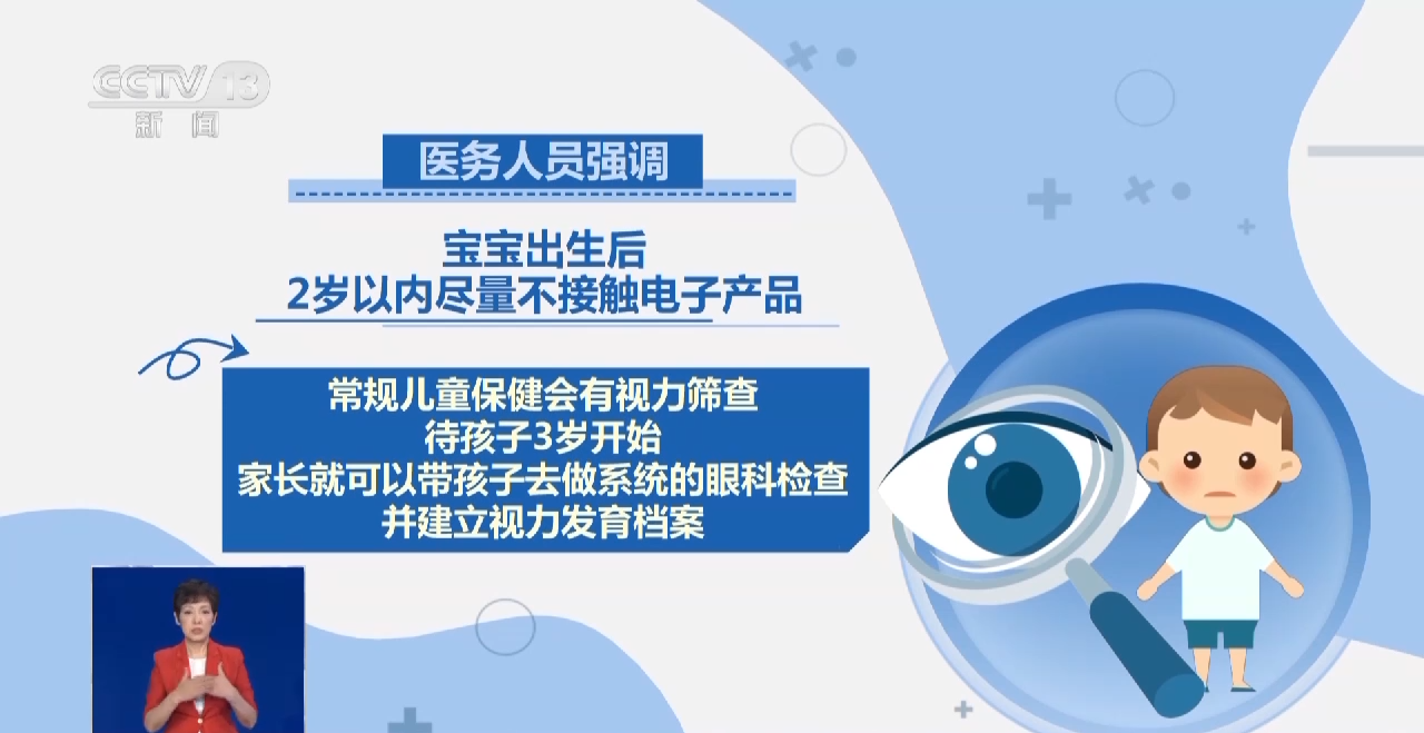 医务人员强调,宝宝出生后,2岁以内尽量不接触电子产品。常规儿童保健会有视力筛查,待孩子3岁开始,家长就可以带孩子去做系统的眼科检查,并建立视力发育档案。研究发现阳光暴露是预防近视发生的有效措施,户外活动有利于减少近视加深,建议中小学生每天至少户外活动2小时,每周至少14小时,可以有效预防近视。
