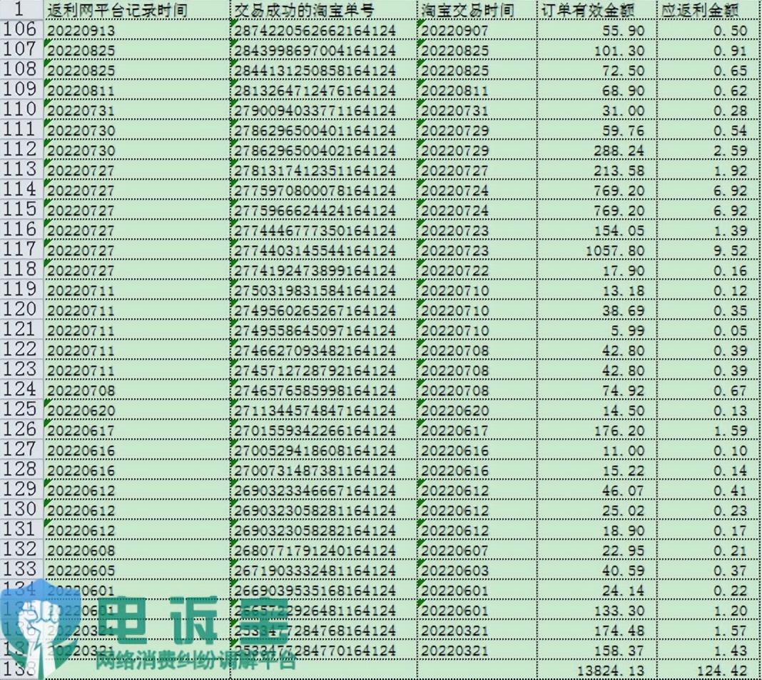 导致李女士累计100多个订单返利无法进行,损失返利金额124.42元。