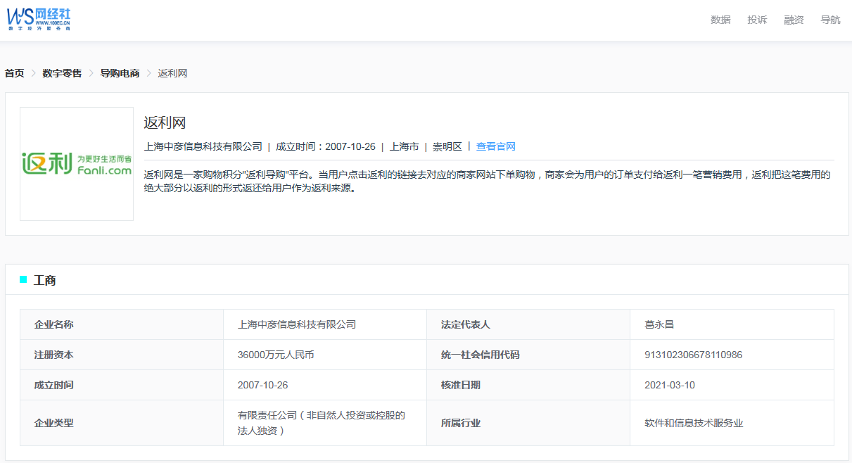 据网经社企业库(COP.100EC.CN)显示,返利网隶属于