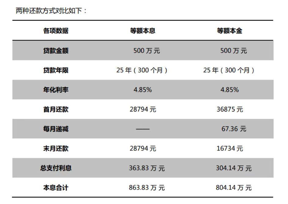 北京中原认为,上述两种还款方式各有利弊,在实际应用中,应该根据购房人个人的实际情况进行选择。比如,王先生以家庭为单位在北京无房,且全国范围内无住房贷款记录。经推荐,王先生准备购买海淀区一套130平方米的住宅,总价1000万元,其可支付一半的房款,剩余500万元申请商业住房按揭贷款25年,等额本息方式的总利息要比等额本金高出59.69万元。