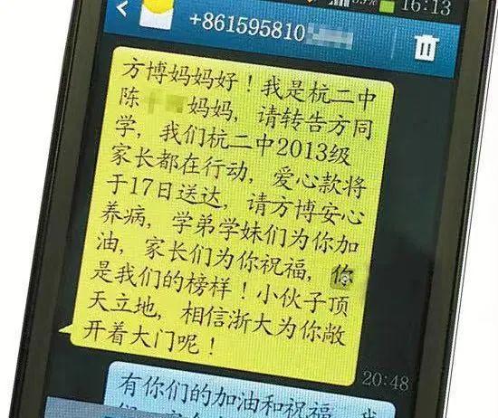 “我是杭二中的一位妈妈,请转告方同学,我们杭二中2013级家长都在行动,爱心款将于17日送达,请方博安心养病。学弟学妹们为你加油,家长们为你祝福,你是我们的榜样!小伙子顶天立地,相信浙大为你敞开着大门呢!”