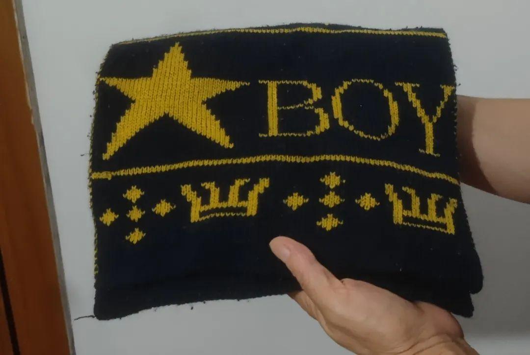 一块是黑底黄色花纹的围巾,上面绣着“BOY”,这是当时杭二中的一位妈妈来送善款,特别带来的。