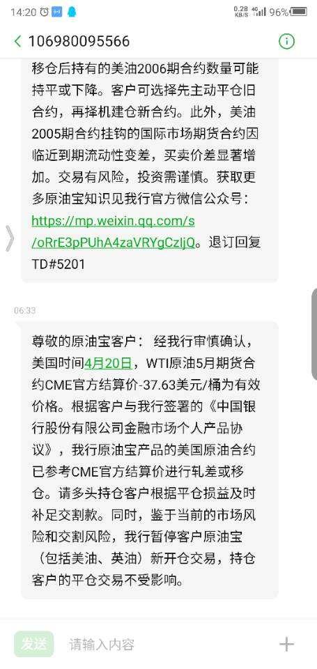 4月22日,中行再次表示,经审慎确认,美国时间4月20日,WTI原油5月期货合约CME官方结算价-37.63美元/桶为有效价格,原油宝产品的美国原油合约已参考CME官方结算价进行轧差或移仓。