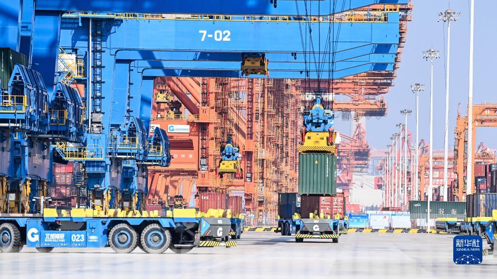 在广西钦州港自动化集装箱码头,无人驾驶车辆在转运集装箱(2023年2月25日摄)。新华社记者 张爱林 摄