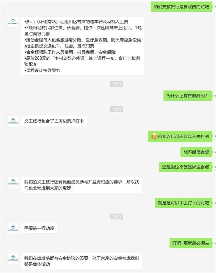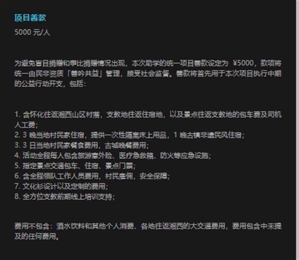 对此,记者联系了善吟共益工作人员,他表示,除原价288元的“乡村支教必修课”线上课程及课程设计指导服务外。收费还包括,往返山区村落的包车费及司机人工费、3晚当地村民家住宿费、伙食费、领队人员费用及相关保险费用。