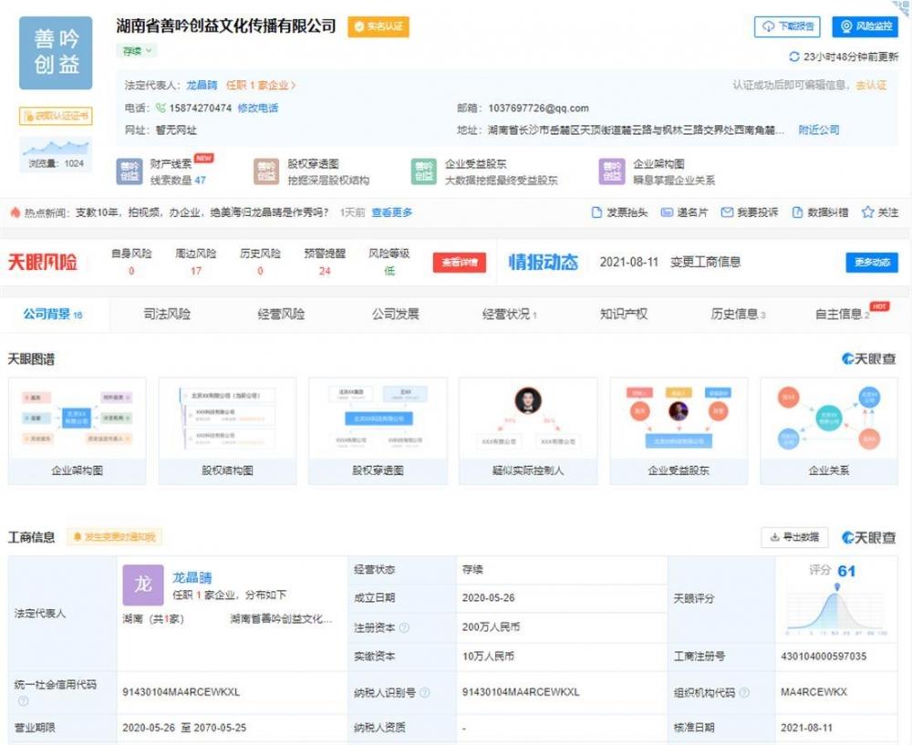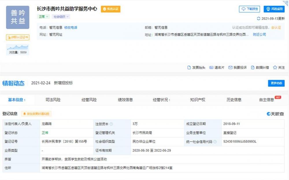 极目新闻记者从天眼查获悉,2020年5月,龙晶睛成立了湖南省善吟创益文化传播有限公司,主营文化、企业活动、品牌等策划及传媒服务。该公司注册资本200万元,龙晶睛认缴出资额160万人民币。2018年,她成立了长沙市善吟共益助学服务中心,开展助学帮扶等活动。