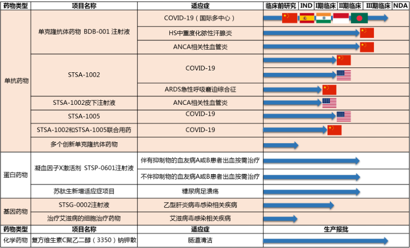 除了新冠药,公司同样手握几张王牌,BDB-001项目多个适应症临床试验稳步推进进,STSA-1005项目已取得 I 期临床(美国)研究总结报告,STSA-1002 和 STSA-1005 联合用药项目取得药物临床试验批准通知书,完成首例受试者给药。