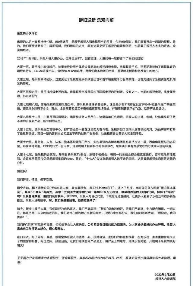 而就在上述拍卖的前几天,乐视全员收到了一封人力资源部名为“辞旧迎新,乐观向前”的内部信,通知“乐视即将于9月24日-25日全体搬离乐视大厦”。在内部信中,乐视再次回应了此前靠房租“续命”的传闻:“如今,新业主接手大厦,我们刚好为自己正名,我们不靠房租!”此前,乐视品牌负责人曾表示,2021年乐视大厦房租收入仅占乐视总体营收的6%。