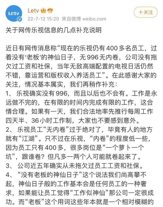 面对“神仙日子”的评价,乐视官方还给出了回应,简直是太凡尔赛了。他们如此说:“乐视没有‘996’,而且以后也不会有。工作是永远做不完的,在有限的时间内完成有限的工作,这合情合理。如果有一天,我们率先推行每周工作四天半、36小时工作制,大家也不要感到意外。”