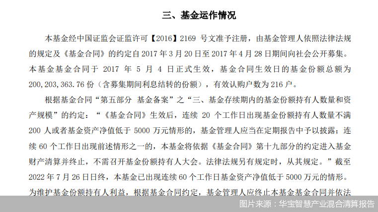 又一只基金清算离场。8月22日,华宝基金发布旗下产品华宝智慧产业混合的清算报告。据悉,该产品此前由于基金资产净值连续60个工作日低于5000万元而触发自动清盘条件,并自8月6日起进入清算期。