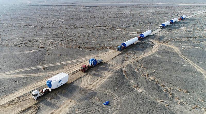 运输车拉载着中速永磁风力发电机组机舱、叶轮和塔筒在戈壁荒漠中奔驰。图片由金风科技提供