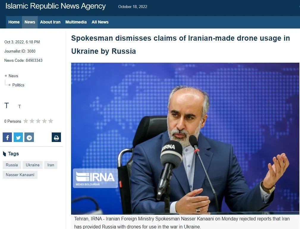 17日,伊朗外交部发言人卡纳尼再度回应此事,言辞升级。他称,“有关伊朗向俄提供无人机的报道是有政治野心的,都是由西方媒体传播的”。他强调,伊朗一直在表达其反战及“避免暴力”,采取“政治解决的必要性”。