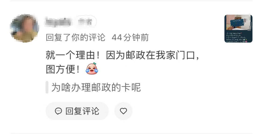 “过程是意想不到的顺利,邮政阿姨耐心地给我讲解利率、年息,前后不到十分钟就办完了,我事先不知道邮政存折是啥样的,办出来样子很简单,我挺喜欢的,很喜欢这种感觉。”