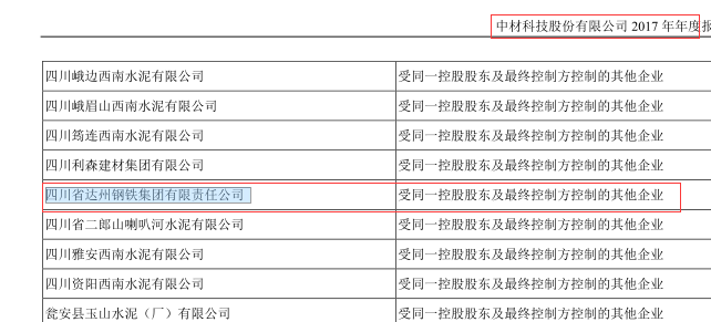 达州钢铁目前似乎也变更了实控方。在中材科技(002080,SZ)的2017、2018年年报中,将达州钢铁列为关联方,属于“受同一控股股东及最终控制方控制的企业”,而中材科技实控人为中国建材集团。