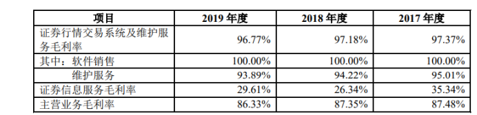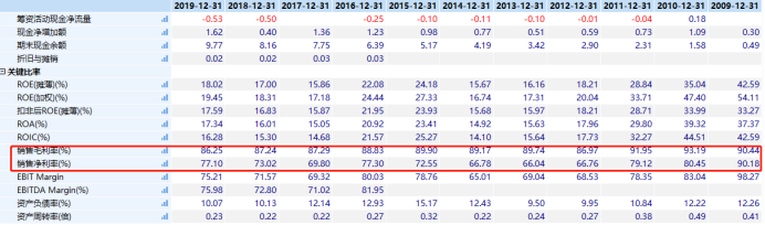 翻阅招股书发现,2017-2019年,其毛利率分别为87.29%、87.24%、86.24%,净利率则分别为77.30%、69.80%、77.1%。