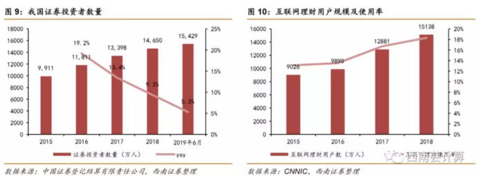 据中国证券登记结算有限责任公司发布的统计月报显示,截至2019年6月底,证券投资者数达到15428.9万户,较2018年底增长5.3%,其中自然人投资者超过15391.9万户,非自然人投资者达到37万户,为证券类APP提供了充足的用户基数。