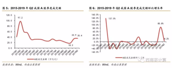 众所周知,在2015年A股交易活跃过后,市场就开始持续走低,成交额在2018年Q4达到15年来的最低点。不过,2019年,投资者开始恢复对市场的信心,2019年Q1市场成交额为33.9万亿元,达到自2016年以来的首个峰值,环比增长85.8%,随后市场行情逐渐回暖。