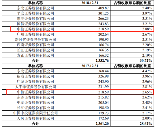 据招股书显示,2017年和2018年,中信证券分别为财富趋势的第一大客户和第三大客户,而财富趋势的第二大股东金石投资也是中信证券的全资子公司。在这其中,中信证券曾在2017年和2018年连续位列财富趋势预收账款前五客户,有意思的是,其他客户预收款项每期都发生变化,只有中信证券两年内一直保持不变,均是218.59万元。