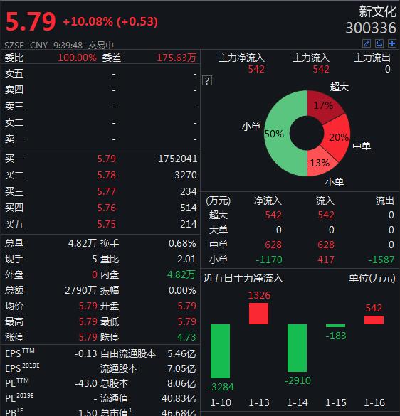1月16日早盘,新文化开盘涨停,报5.79元,封单超175万手,总市值46.68亿。