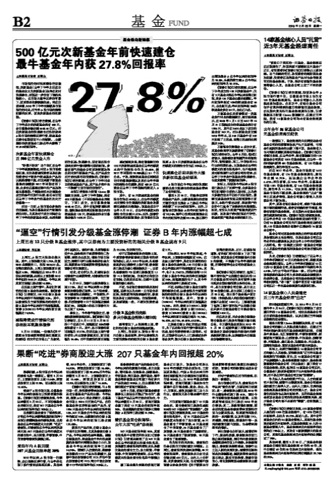 在这波上涨行情中,具有杠杆属性的分级B基金收益亮眼。据《证券日报》记者统计,130只分级B基金今年以来的平均涨幅超30%。其中,以券商股为主要投资标的的相关分级B基金今年以来的平均涨幅最高,证券B(502012)今年以来的累计涨幅高达74.96%。