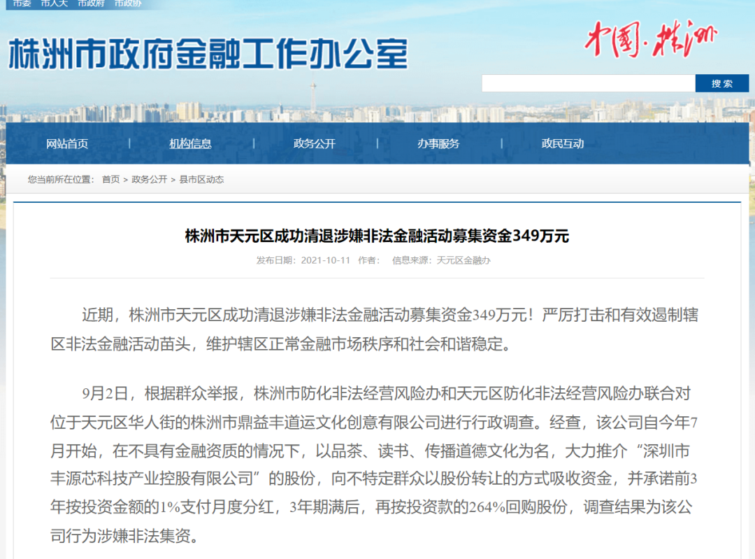 值得一提的是,去年10月,株洲市天元区金融办发布了一条消息,根据群众举报,一家名为“株洲市鼎益丰道运文化创意有限公司”遭到相关部门调查,成功清退涉嫌非法金融活动募集资金349万元。