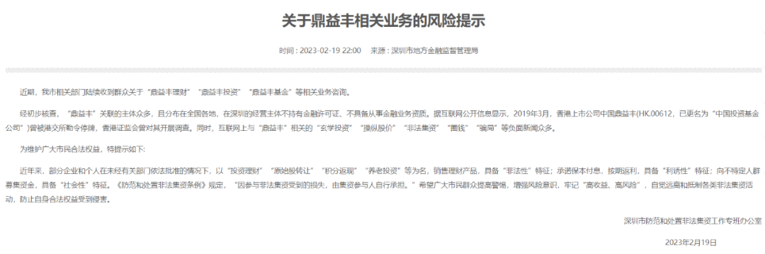 2月19日晚,深圳市地方金融监管局发布关于鼎益丰相关业务的风险提示,“鼎益丰理财”、“鼎益丰投资”、“鼎益丰基金”等业务背后的“鼎益丰”关联主体众多,在深圳的经营主体无金融许可证、不具备从业资质。这条提示的发布方为深圳市防范和处置非法集资工作专班办公室。