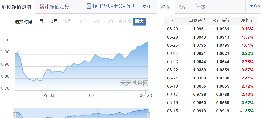 截止6月29日,由邹唯管理的汇安均衡优势混合基金的最新净值为1.0961元,至此已连续8个交易日站上1元上方。如果从最低时的0.7734元谷底算起,该基金净值足足上涨了41.72%。