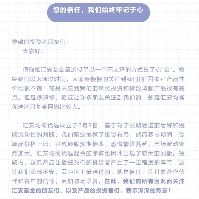 因新基金净值大幅回撤,3月4日深夜,汇安基金紧急发出740字诚意满满的《致歉信》——“我们深感不安,希望大家给我们一些时间。在此,我们向所有因此而关注我们的朋友,表示深深的歉意!”
