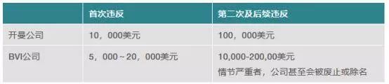 当地税务机关将负责认定相关个体是否通过经济实质性测试;无法通过经济实质性测试之相关个体,当地税务机关除通知并指正外,还可能要求该个体缴纳高达数万美元之罚款(见下表),情节严重者,甚至可以