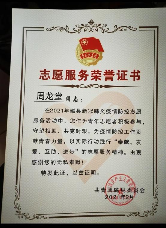 周龙堂身为青年人,能为家乡出一份力,做一些事儿,内心是无比的自豪和欣慰的,在新冠肺炎疫情期间,作为青年志愿者,他积极参与到疫情防控志愿服务活动中,以实际行动践行“奉献友爱,互助进步”的志愿服务精神,被共青团磁县委员会颁发“志愿服务荣誉证书”。