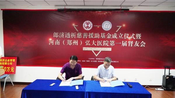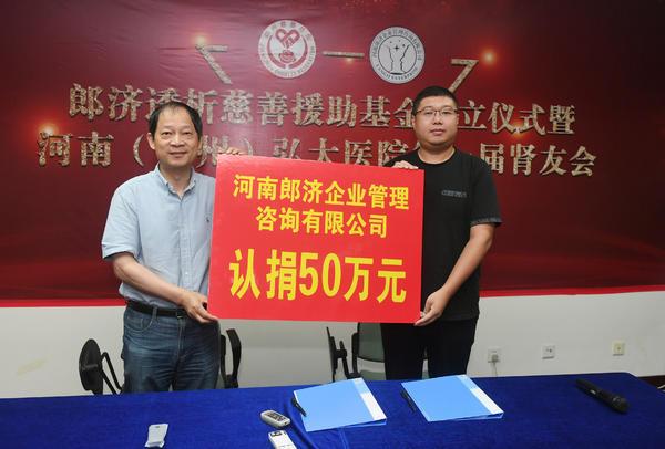 8月18日上午,河南郎济团队携手郑州慈善总会,在河南(郑州)弘大医院三楼会议室举行"郎济透析慈善援助基金"成立仪式,活动现场,河南郎济团队首席专家赵显国教授向郑州慈善总会捐赠50万元,成立专项基金,用于救助我省家庭困难的血液透析患者。
